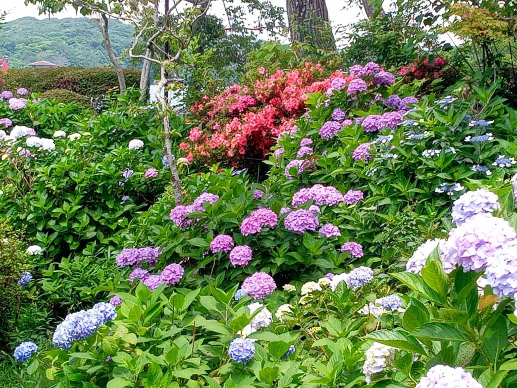時々、日差しの射す中「あじさい苑」では約1,500株のアジサイが鮮やかに咲いていました。