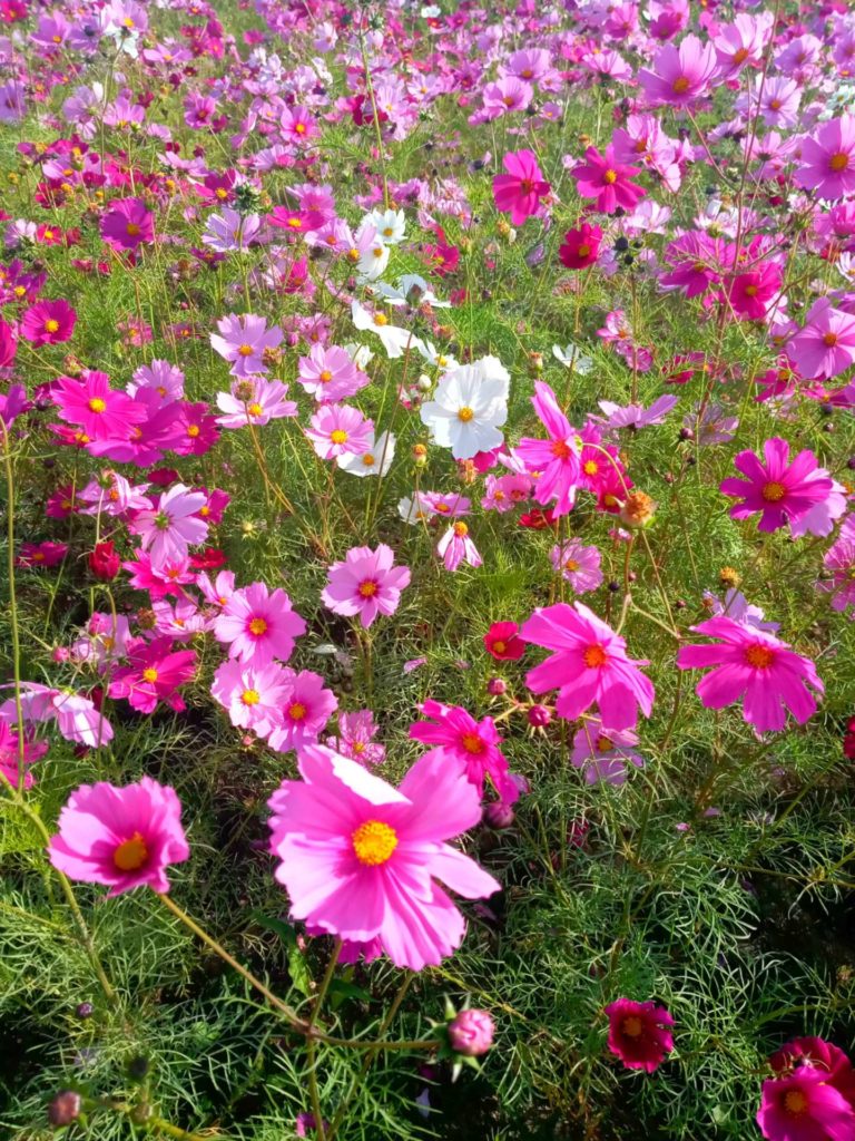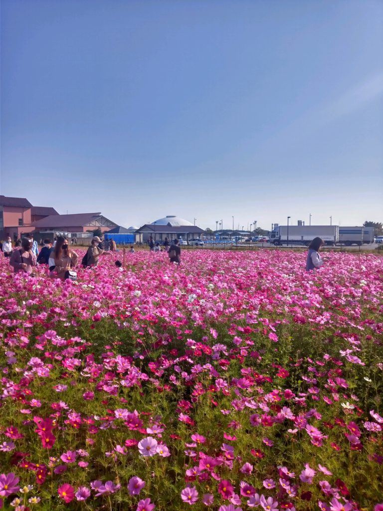 山口県立山口きらら博記念公園そばにある道の駅きららあじすの「コスモス畑」に行ってきました。 子供の頃に野原で見たコスモスは、見上げるほどに背が高く強い風が吹くと倒れてしまいそうに儚げでした。 以前テレビで、コスモスも品種改良が進み背が低く丈夫で花びらの数や色も変化したと聞いたことがあります。 道の駅きららあじすの コスモスも丁度見やすい背丈で咲き誇っており、白とピンクの色変わりのコスモスや定番の8枚の花びら以外に複数の花びらを付けた花までありました。 広い敷地の中で四つ葉のクローバーを見つける感覚で珍しいコスモスを見つけてみてはいかがでしょうか。