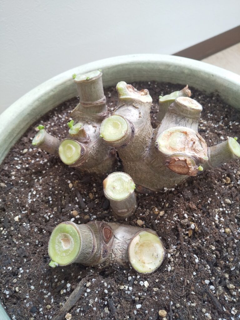 下の写真は、今年の1月頃にバッサリ切って枝だけになった金のなる木です。