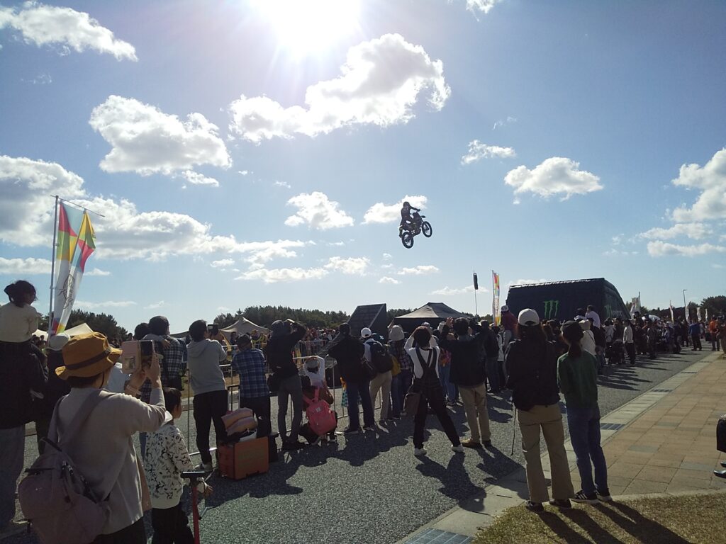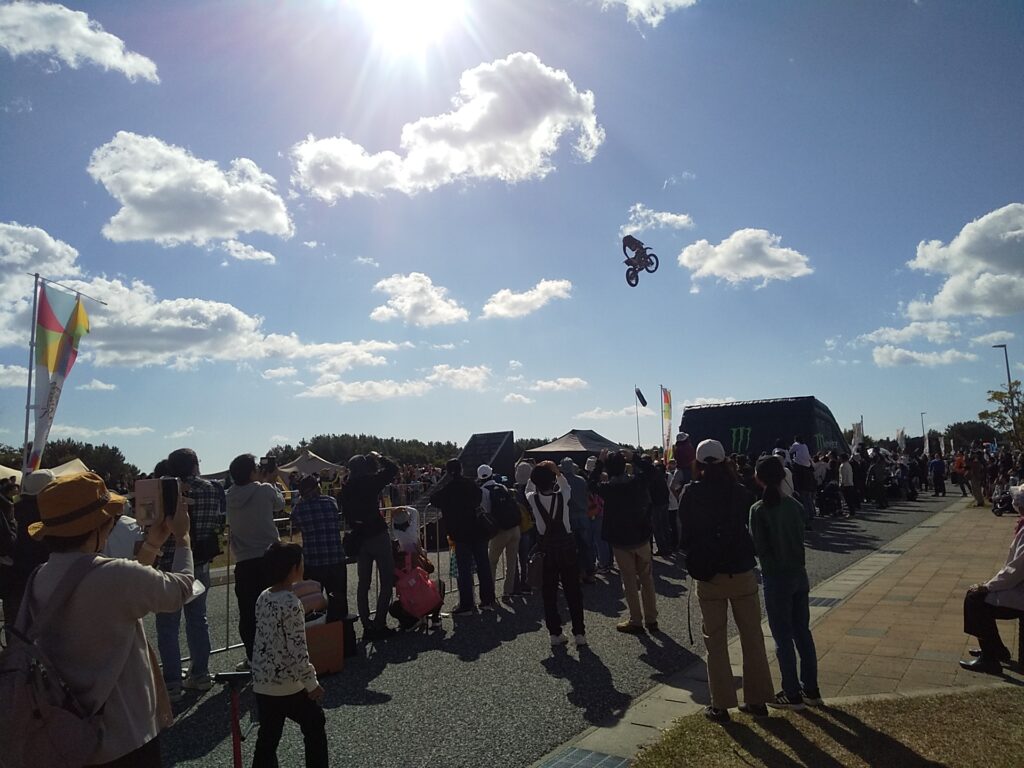 バイクのフリースタイルモトクロスのショーは山口県初上陸だそうです。ジャンプ台を飛んでひっくり返ったり手を離したり!